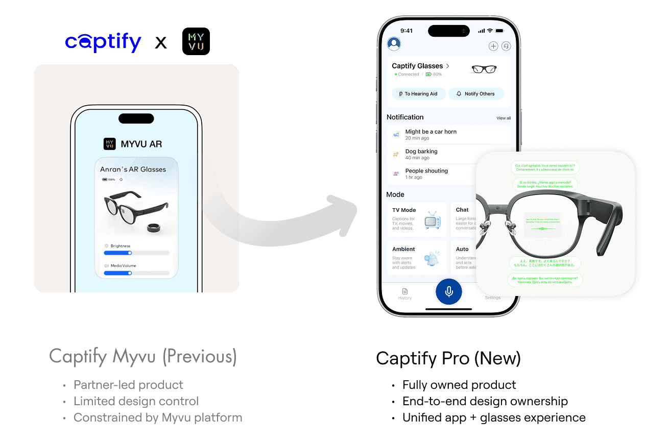 Compared to the previous MyVu product, Captify Pro Phase 1 MVP launched with a redesigned mobile app and glasses OS, introducing real-time captions and environmental sound detection as core experiences.