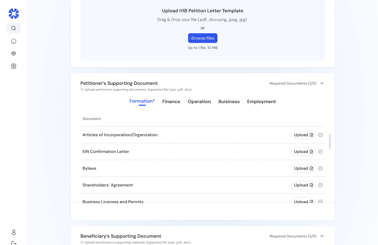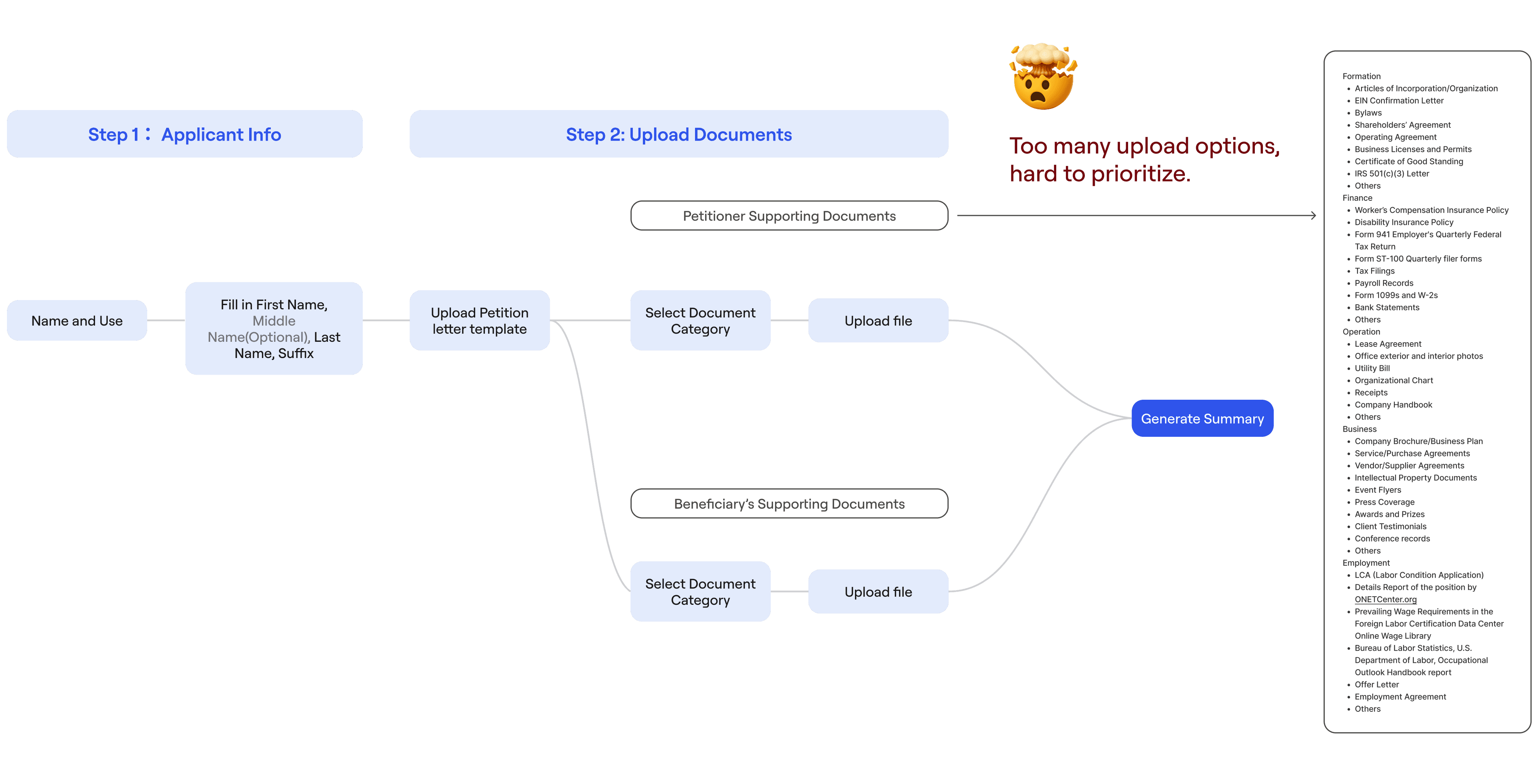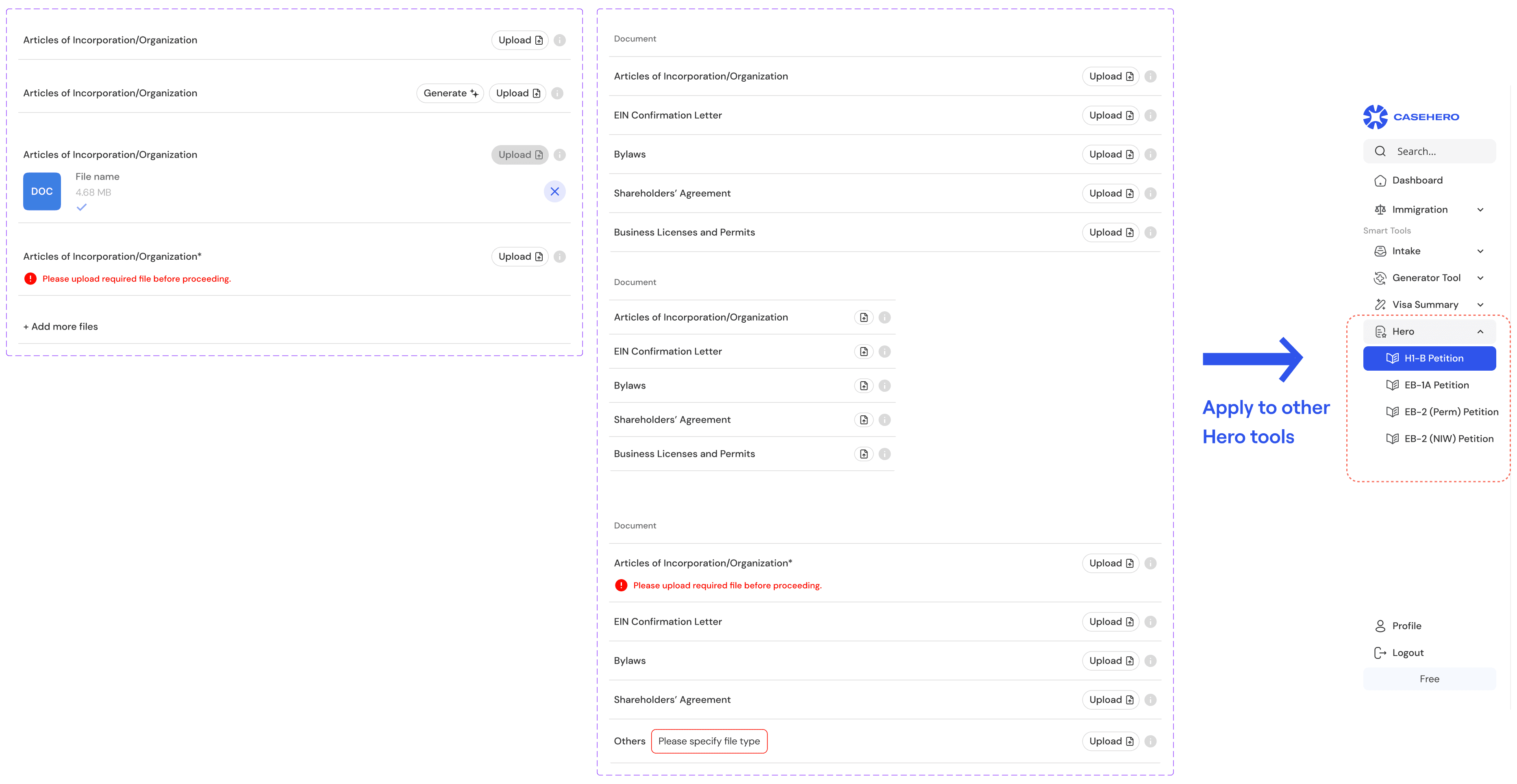 • Built a scalable upload system that works across multiple visa types, reducing future redesign and engineering effort. • Unified components into a consistent, reusable design framework that clearly guides users through required documents. • Added seamless entry points to other CaseHero tools, allowing users to generate missing documents without leaving the workflow.