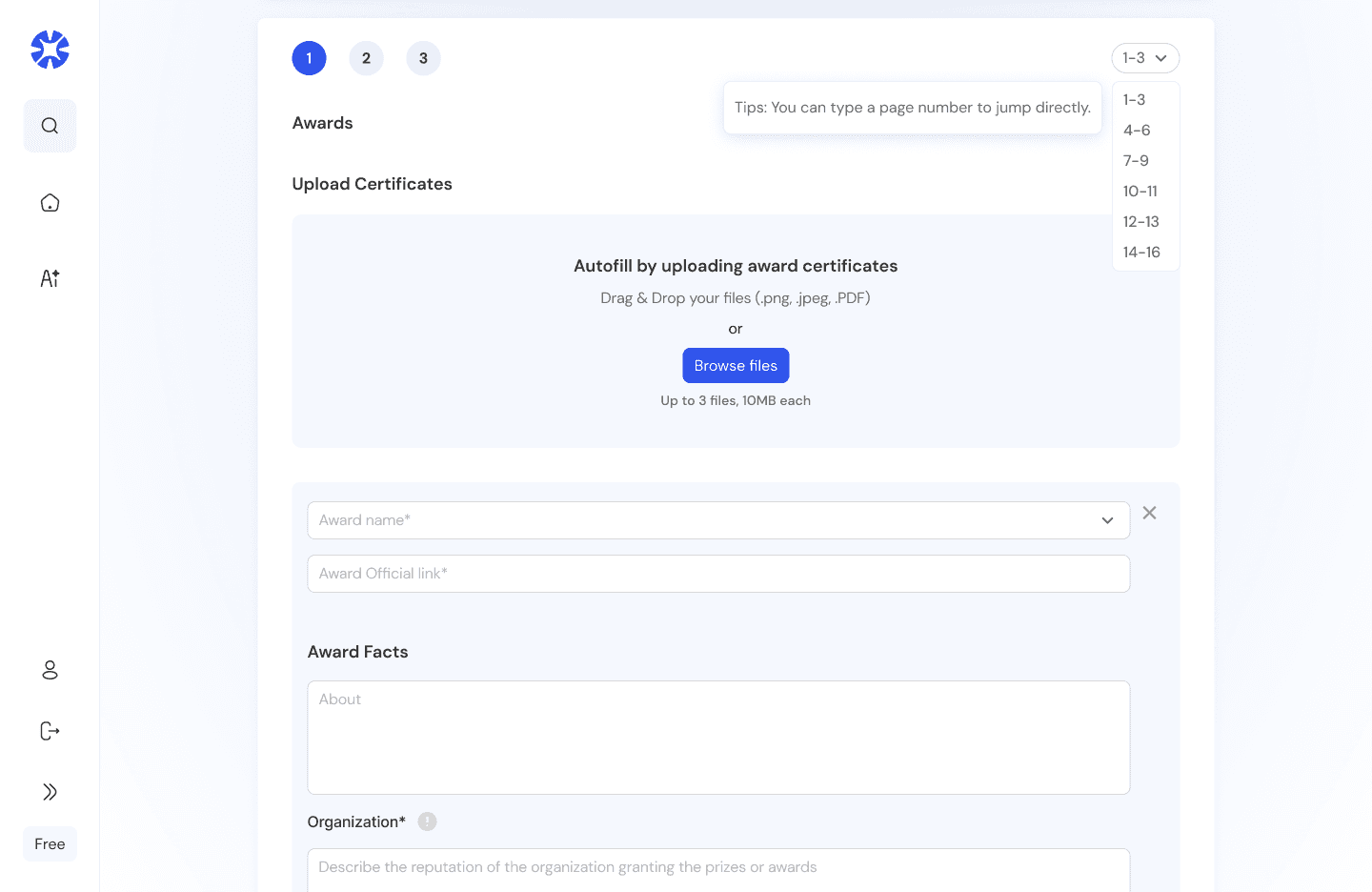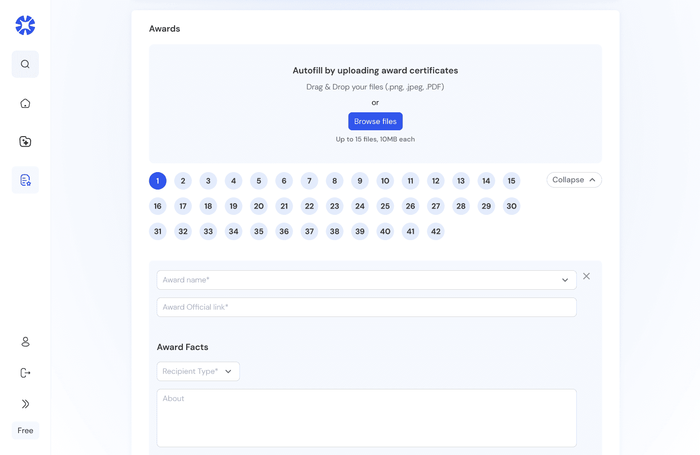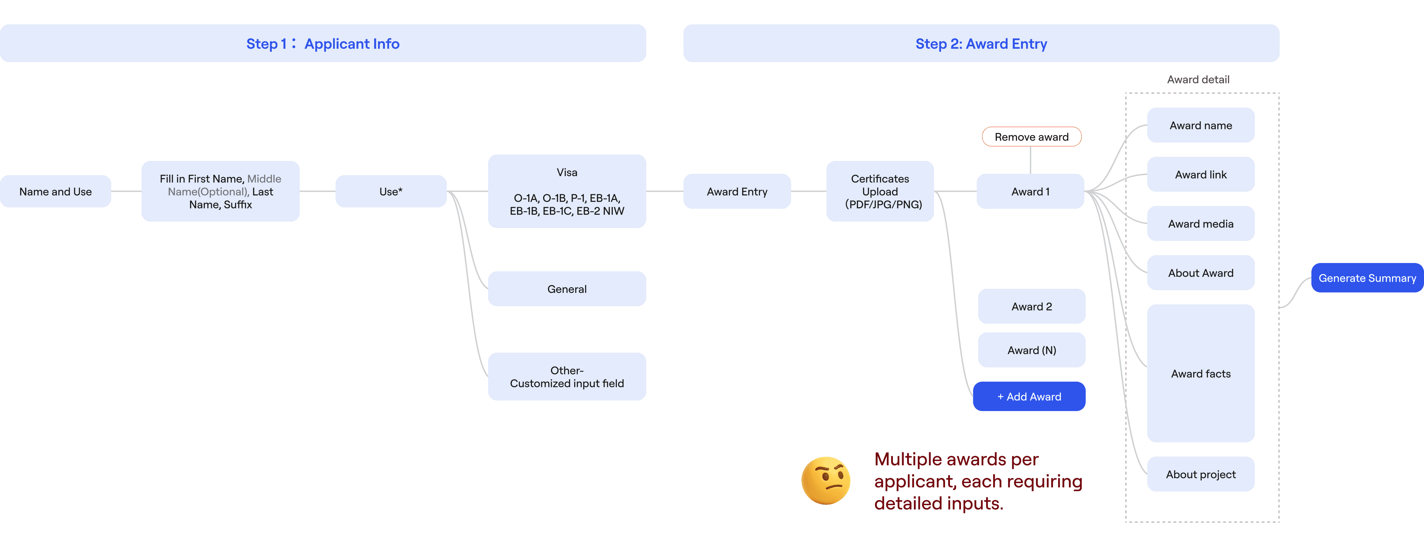 To support users with many awards, We replaced tabs with numbered navigation (Award 1, 2, 3…). Each form could collapse after completion to reduce clutter.