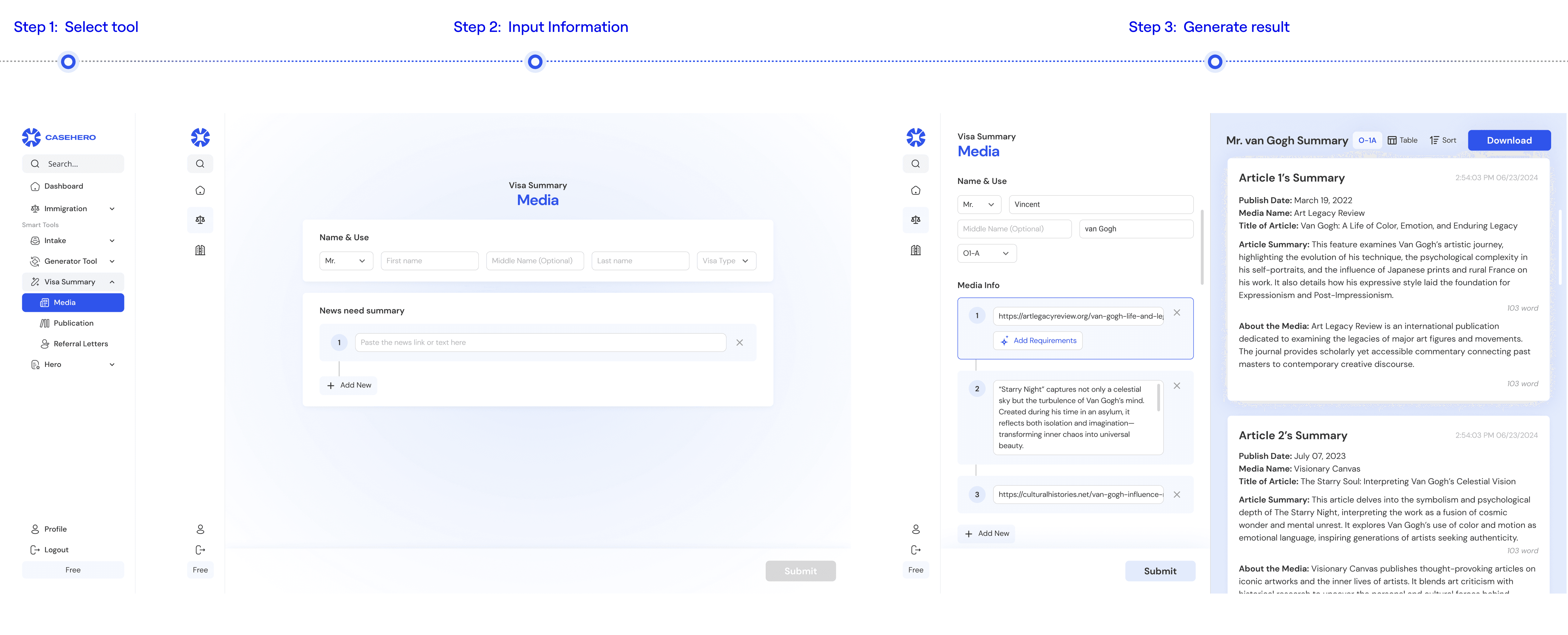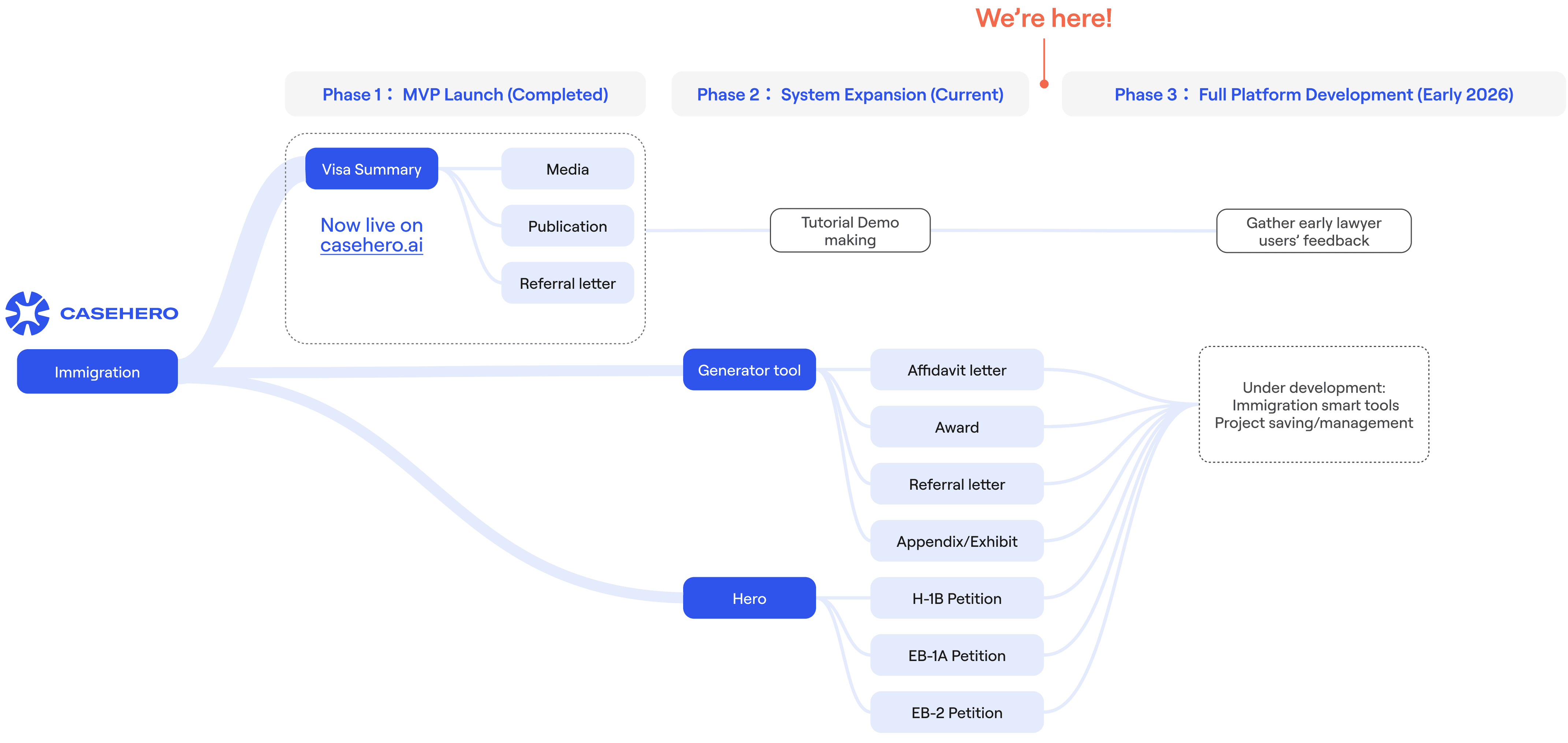 CaseHero helps immigration lawyers generate complex petitions faster with AI. As the product designer at VSDesign, I designed the core workflow system, aligned stakeholders, and delivered features continuously into development. Three tools are live with 10+ more handed off, driving early adoption and momentum.