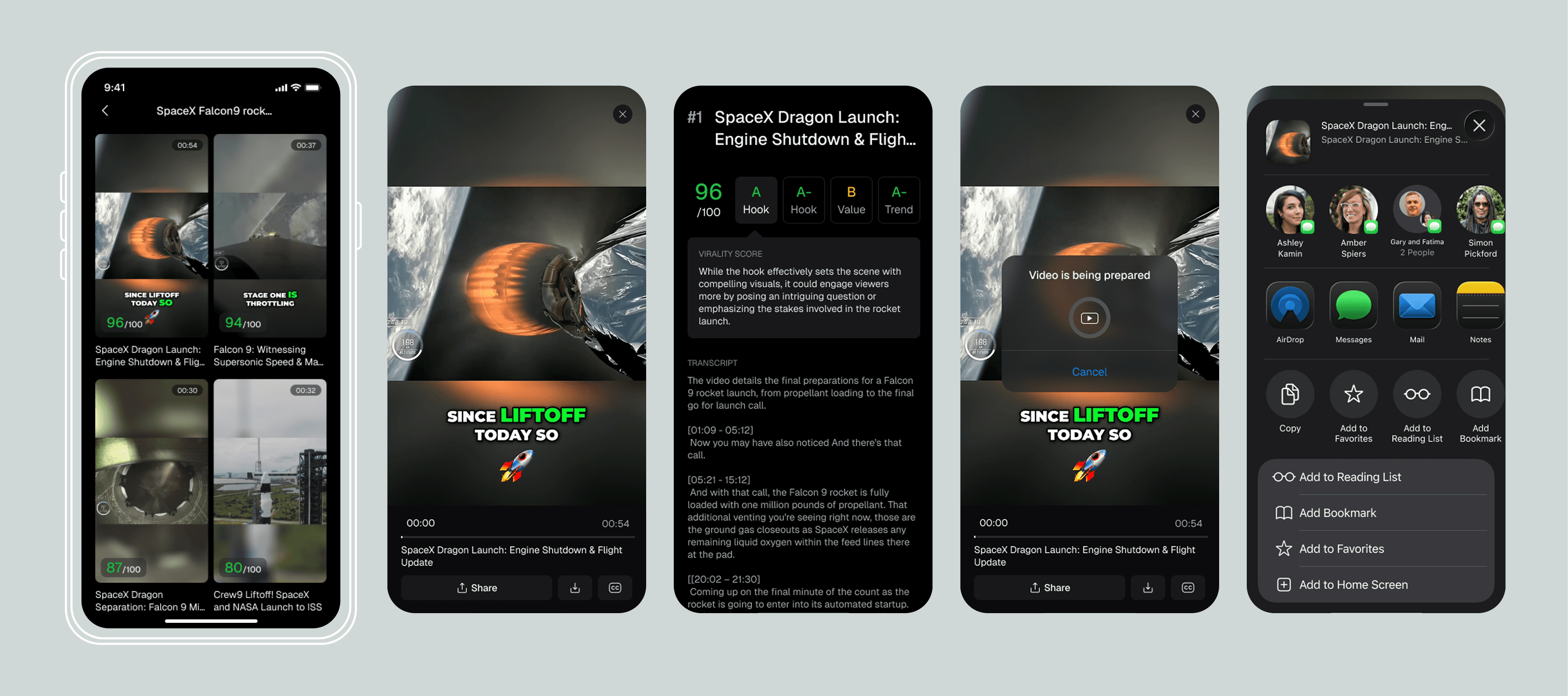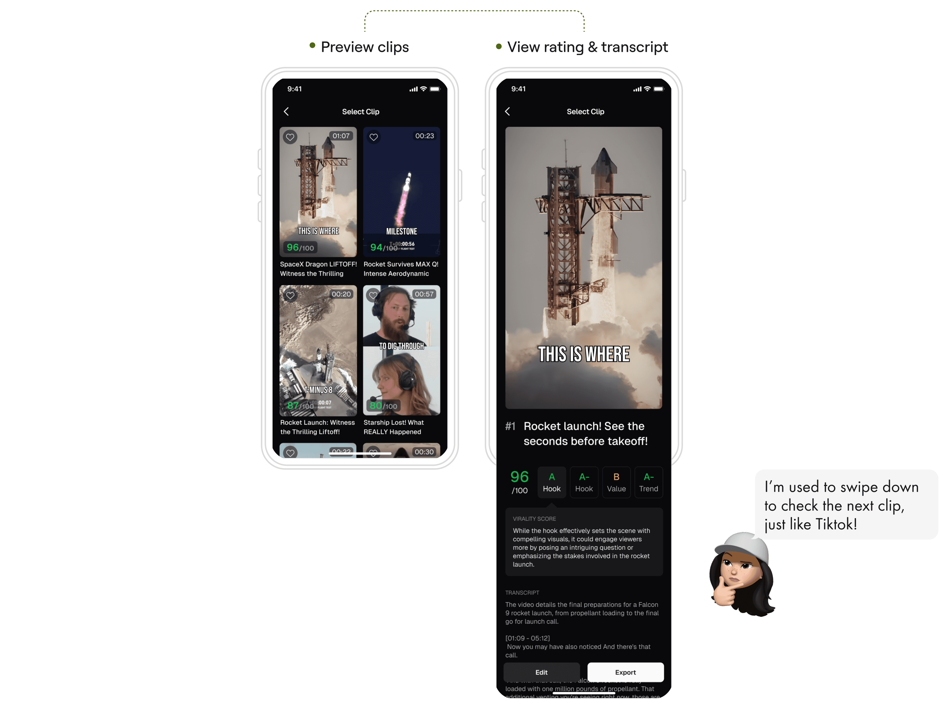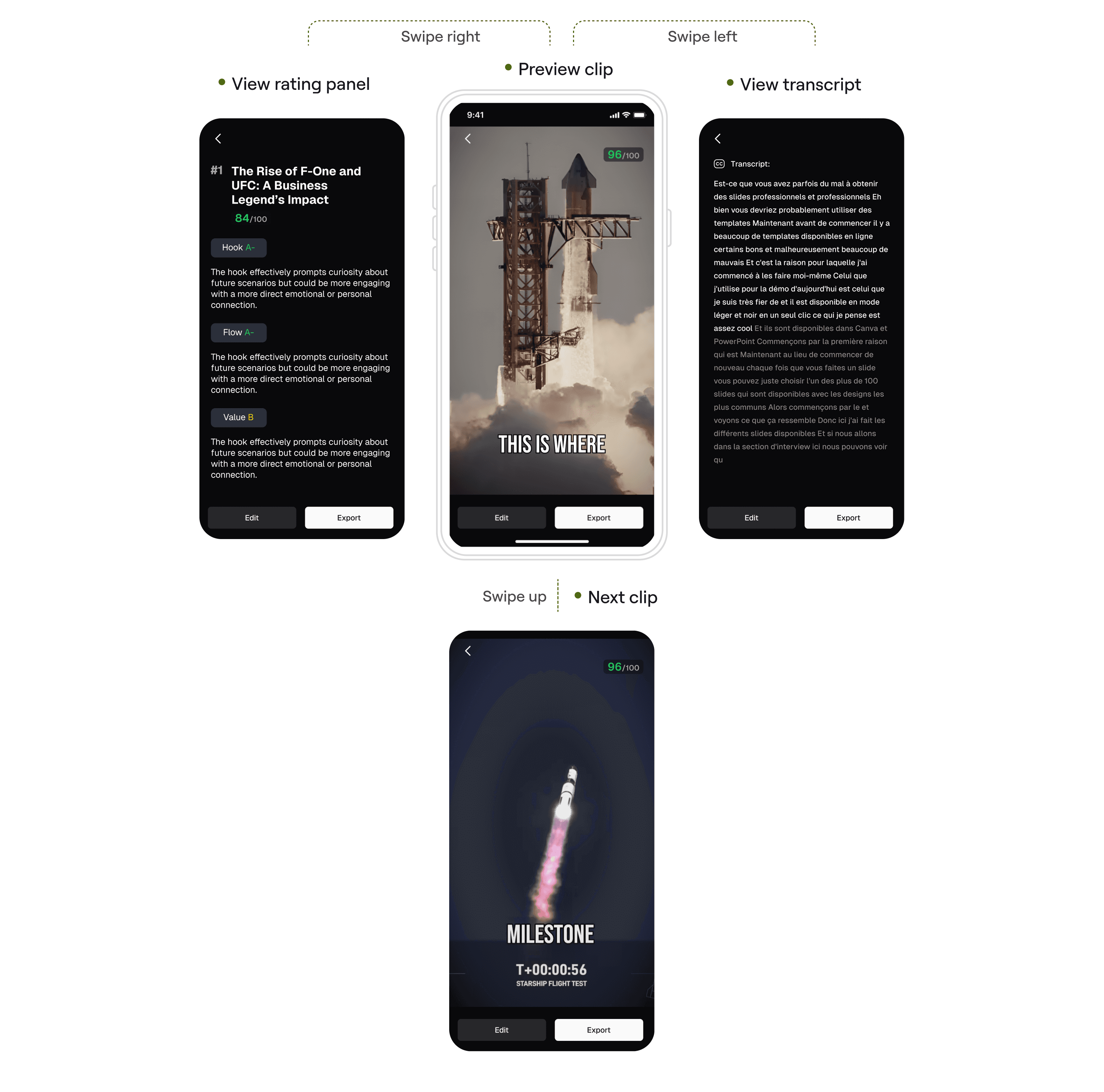 Scroll vertically to preview clips, swipe horizontally to view ratings and transcripts.