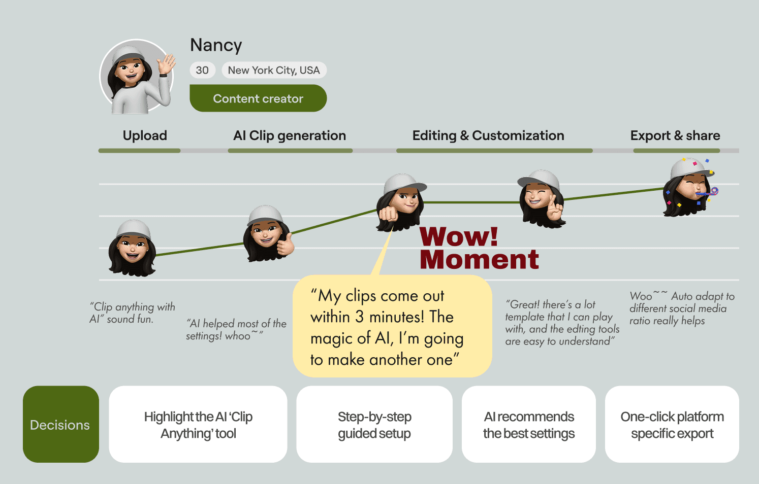 After clip generated, AI will rate the clips and user select the one they would like to go with.