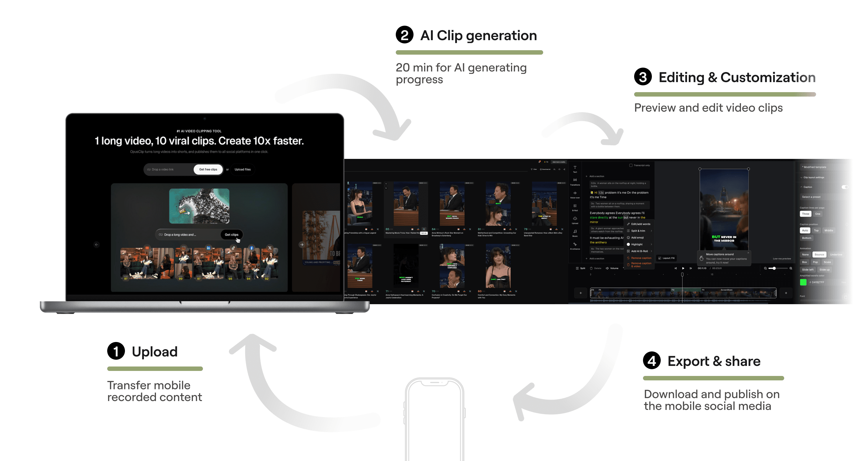 + Eliminates the need to transfer mobile-recorded content to a web platform. + No need to wait 20 minutes-monitor AI progress, preview clips, and publish directly on mobile without returning to desktop.